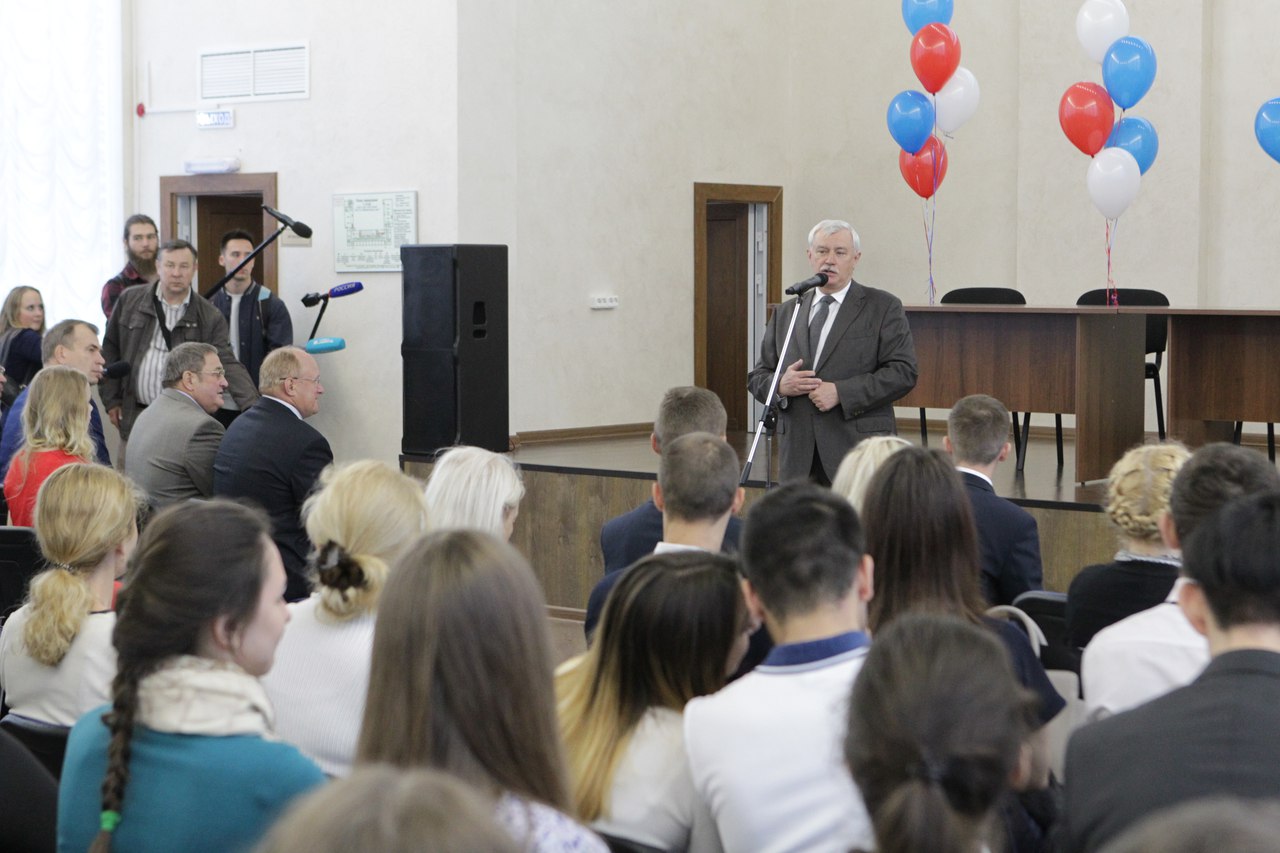 Губернатор поздравил студентов колледжа с новым учебным годом и новосельем, вручив символический ключ от общежития сопредседателю Студенческого совета Санкт-Петербургского технического колледжа управления и коммерции, победителю конкурса «Студент года – 2015» Илье Жидкову.
